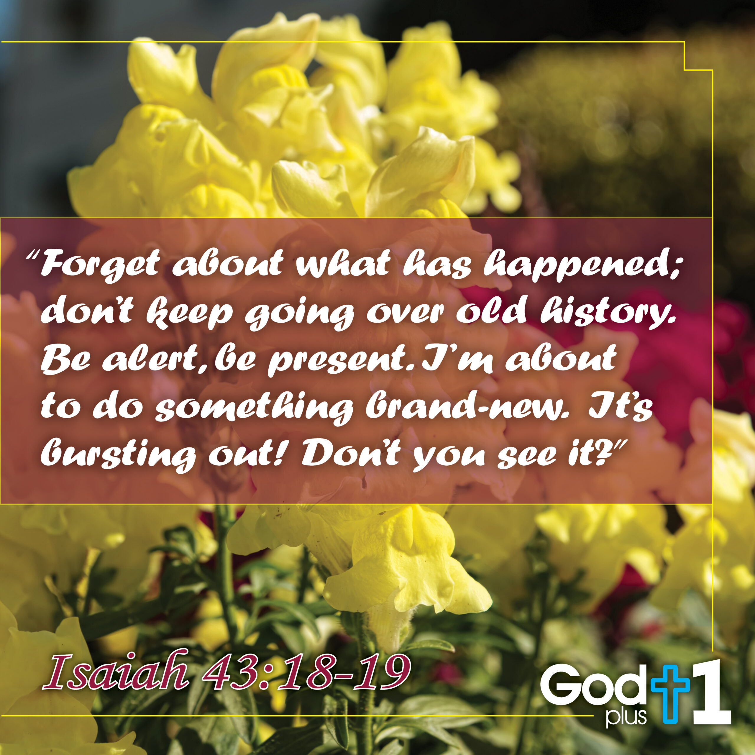 Verse Reflection: Grace is magnificent. It eliminates the past and gives us unimaginable hope for the future. Making a road through the desert is how I have felt on this journey. I trudge through the sand, moving the sand from the right to the left and then I turn and see that the sand has folded into the landscape and disappeared. But the problem is I have tried to create the road on my own. I need to have a peaceful confidence that Christ is making this road. He is bringing water into the desert. God is “about to do something brand-new”. Hallelujah, God be praised. We can have perfect-peace and know that Christ has overcome the world and therefore has overcome our challenges. We are inviting Him on this journey with us. That is all the difference. We are going to tell Him over and over that we trust Him. The past is gone and today is brand-new. Fear of failure is gone because we are no longer dependent on ourselves. God is changing us, He is changing our choices. He will walk with You everyday. We are going to achieve the victorious life that God has promised us. We will forget my failures and we will celebrate with God the victory we will have today. We will look at our past as a beautiful opportunity for God to show His transformative power. We must not miss the opportunity to be alert. It is too easy to just run to a meal and eat it quickly. God’s power and glory is at work. We need to stop and acknowledge it. We must be alert and thank God for this power, we must be present and allow God to convict us in our choices.